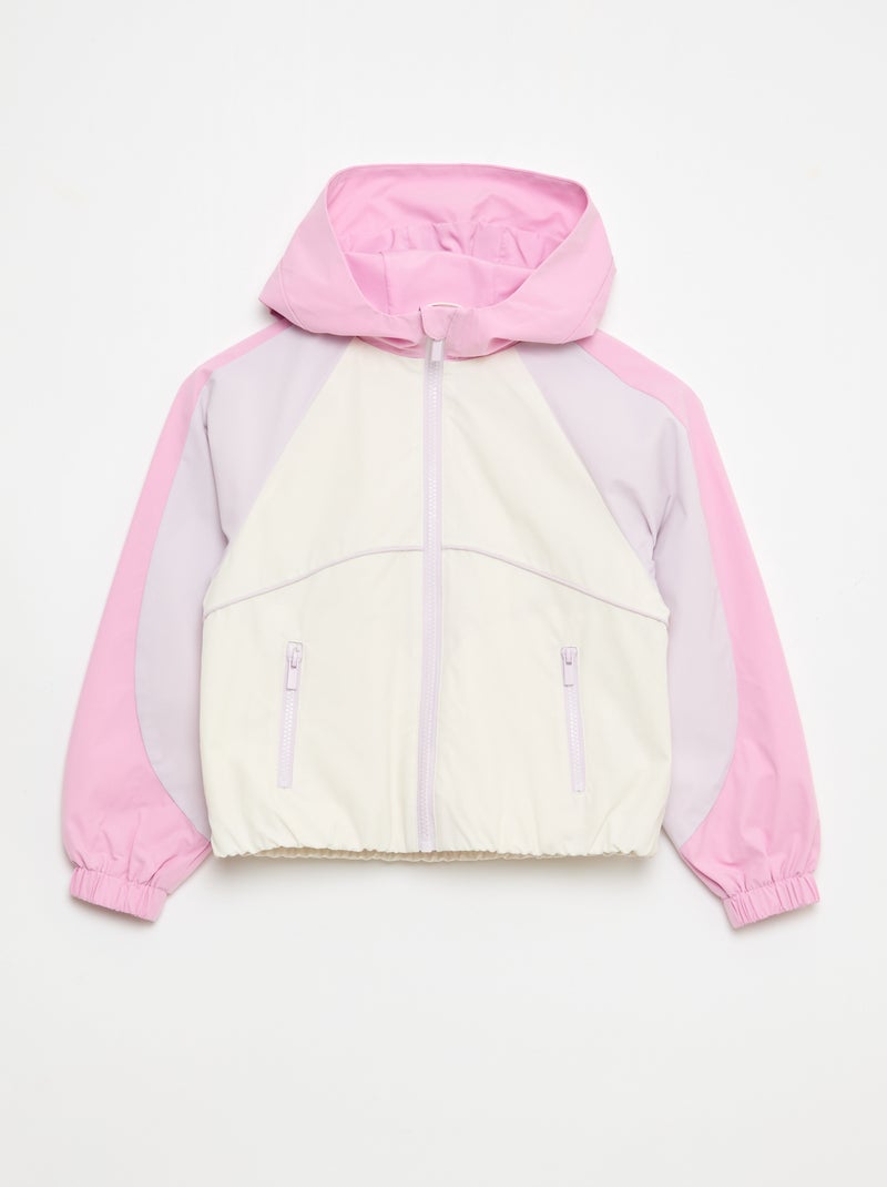 Un blouson coupe-vent à capuche conçu pour protéger du vent et de la pluie, avec des détails pratiques.