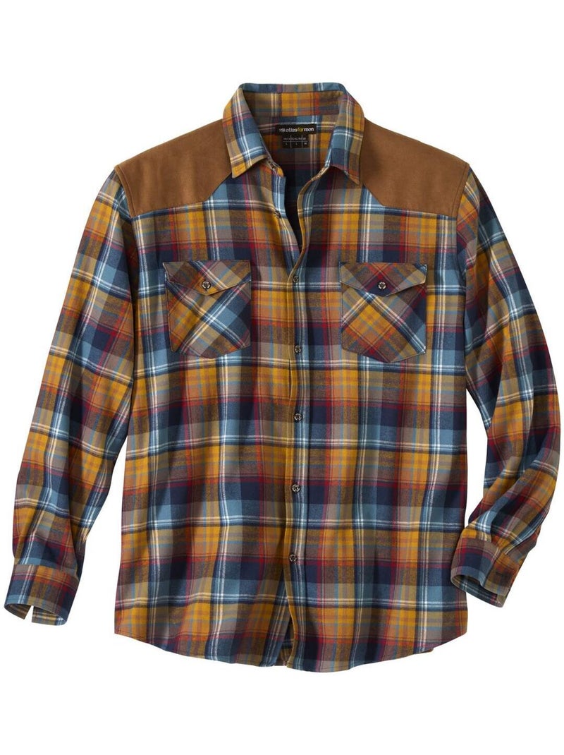 Chemise Flanelle Carreaux Empiècements Suédine  - ATLAS FOR MEN - Bleu Marron