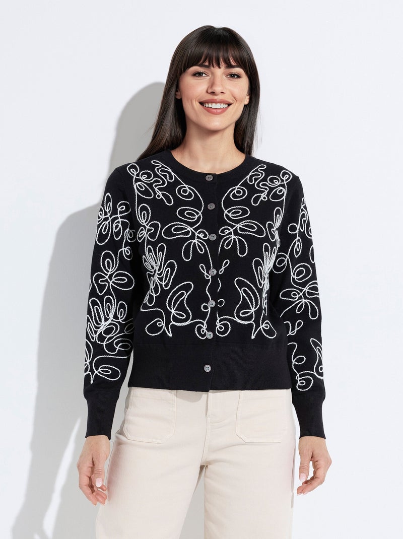 Gilet cardigan boutonné court brodé - Noir Beige