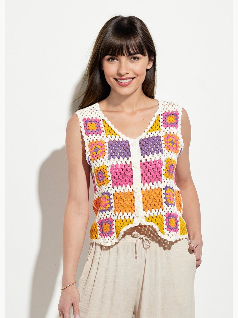 Gilet col V sans manches en crochet - Rose