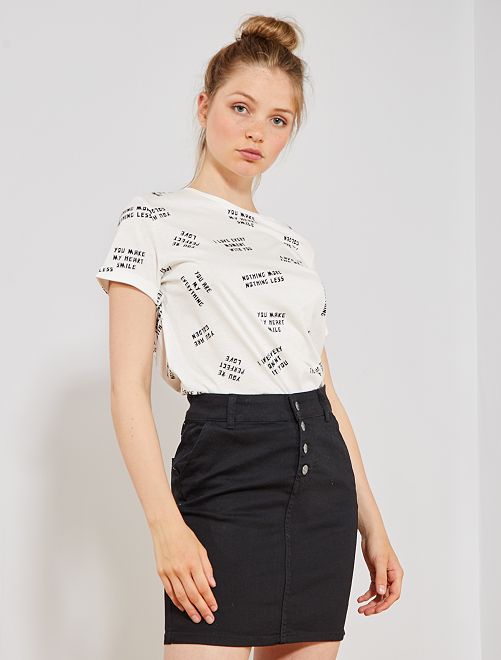 En denim stretch, cette jupe est coupée près du corps pour un style décontracté féminin. Une originalité : sa braguette boutonnée apparente.