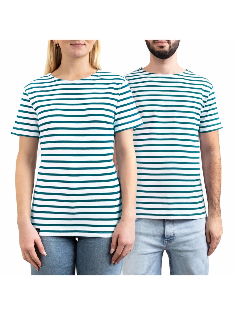 Marinière 'Breizh Océan' Homme ou Femme, T-shirt rayé mixte manches courtes - Blanc/Jean