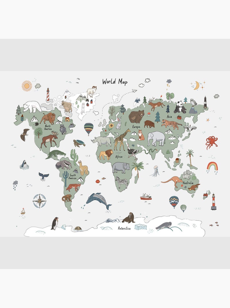 Papier peint intissé - Carte du monde avec animaux verts et gris (dessin) - 375x270 cm - Multicolore