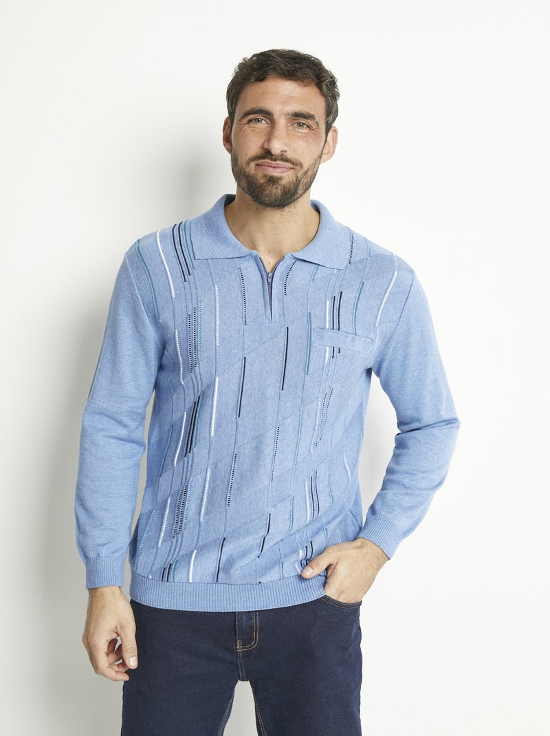 Pull col polo zippé manches longues coton jacquard - Bleu