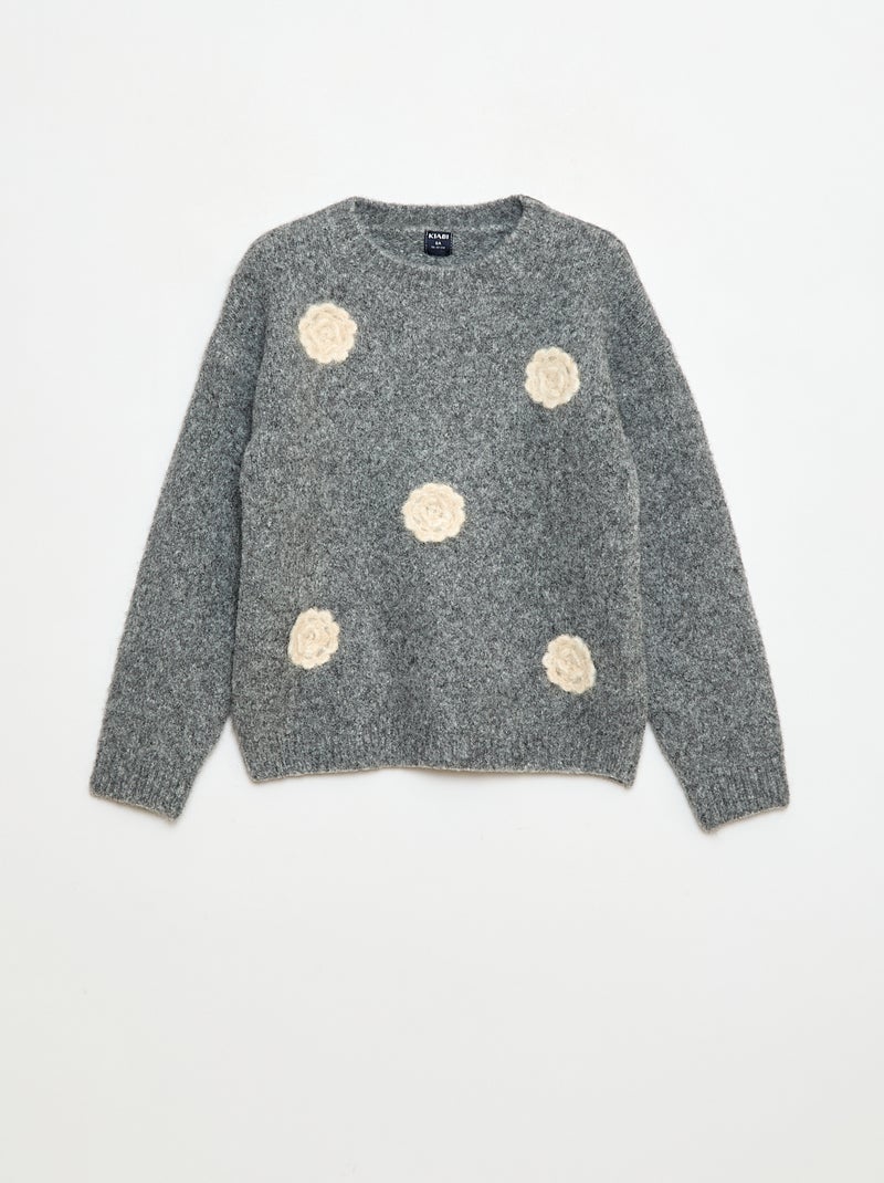 Pull col rond avec fleurs en crochet uni - Gris