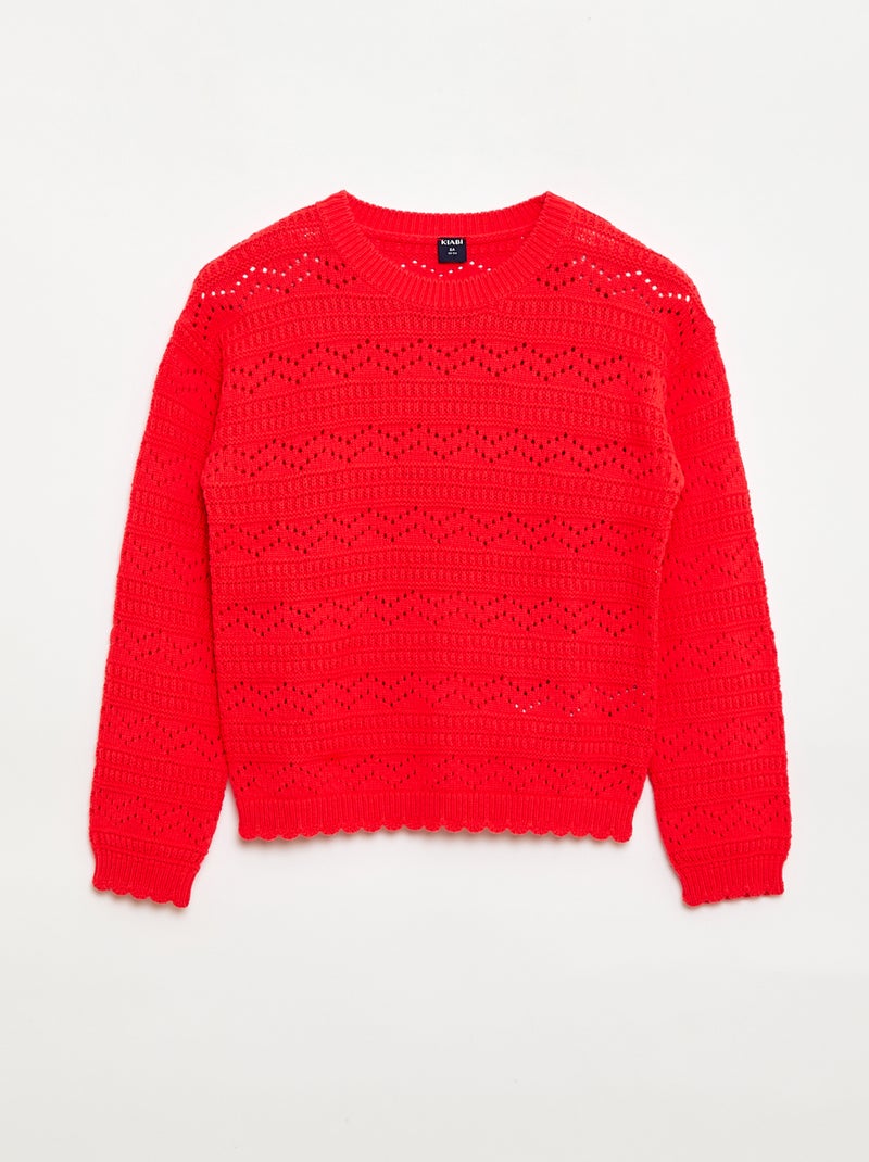 Pull col rond maillé fantaisie avec motifs ajourés en coton - Rouge