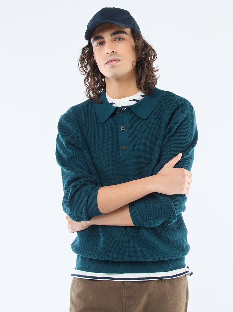 Pull maille gaufrée à col polo - Bleu