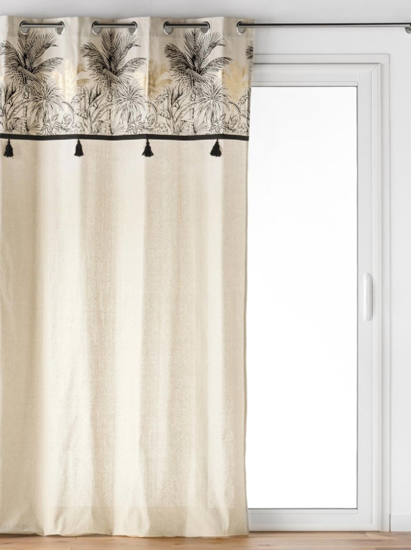 Rideau à Oeillets Papaya Palmiers à pompons et Top Métallisé - Bois naturel