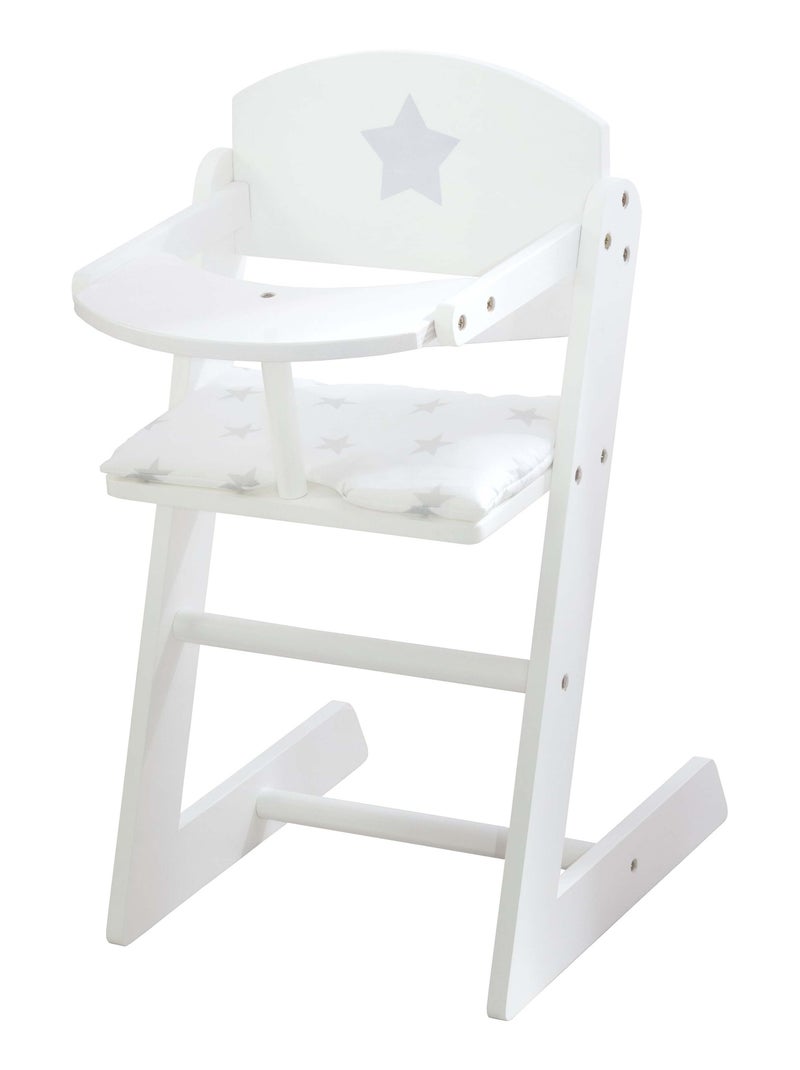 ROBA Chaise haute pour Poupée "Stella" en bois + Coussin Étoilé + Plateau Repas - Blanc/Gris - Blanc Gris