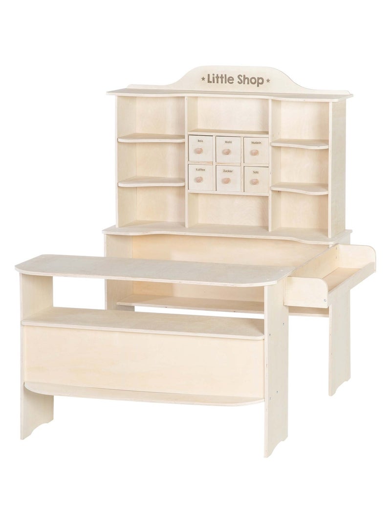 ROBA Grande Marchande Enfant en Bois à Étagères et 6 Tiroirs + 2 Comptoirs - Bois naturel