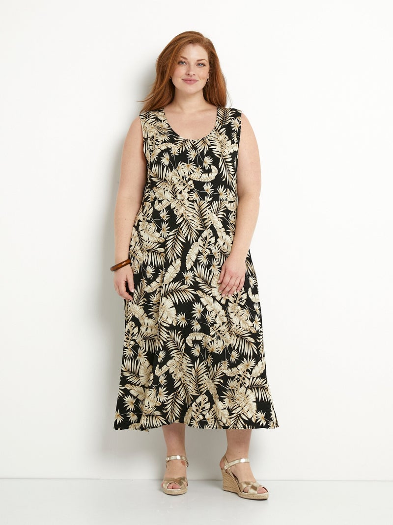 Robe longue sans manches évasée imprimé feuillage - Noir Beige