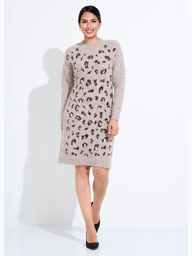 Robe pull col rond motifs animaliers en sequins - Beige/Noir