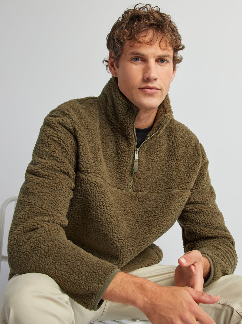 Sweat effet moutonné à col zippé - Kaki