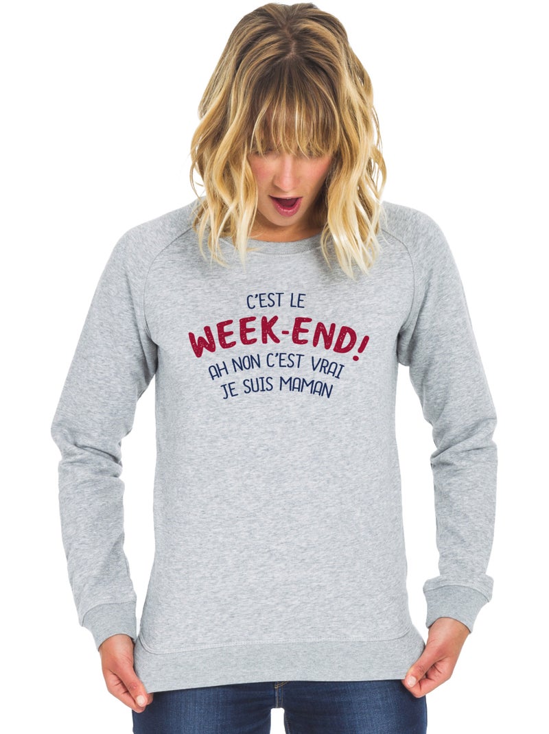 Sweat Femme - C'EST LE WEEK END ! AH NON C'EST VRAI JE SUIS MAMAN 2 WAF - Gris chiné