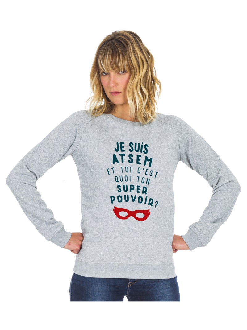 Sweat Femme - JE SUIS ATSEM ET TOI C'EST QUOI TON SUPER POUVOIR ? - Gris chiné