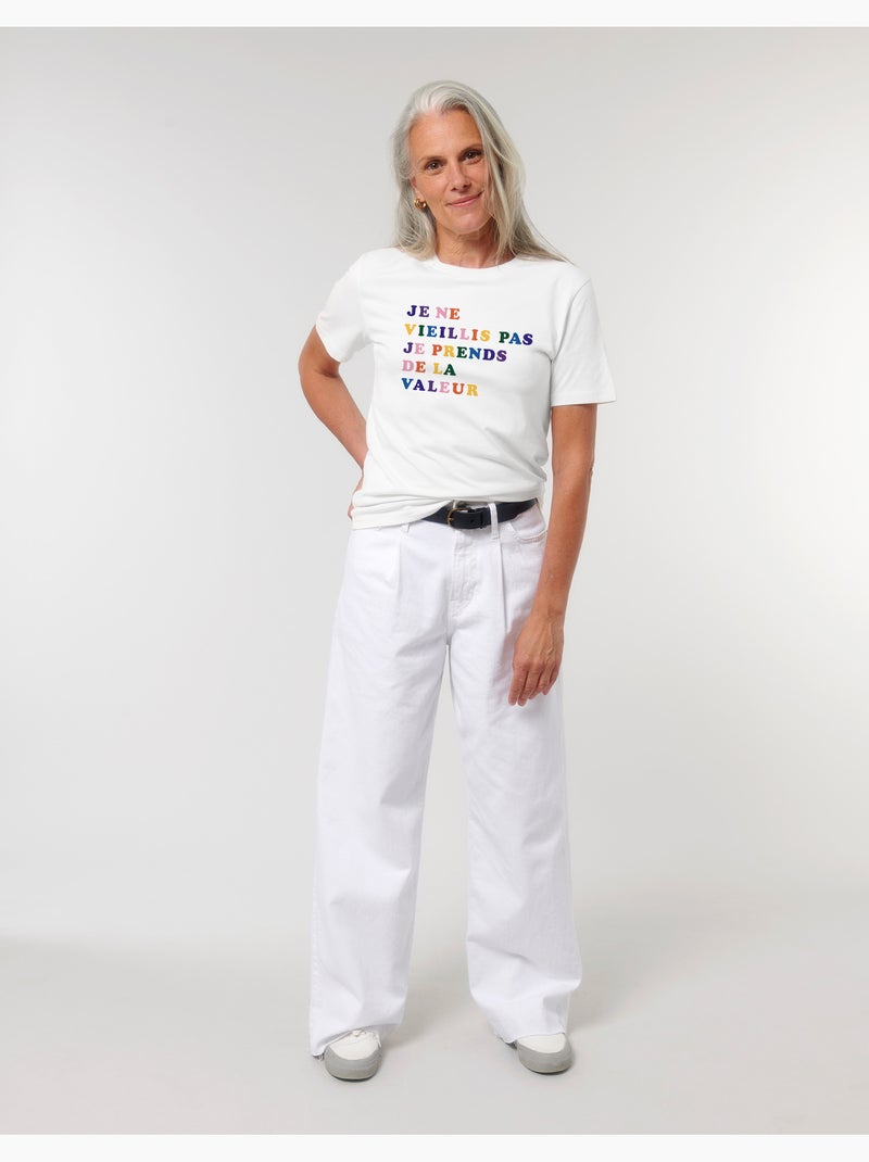 T-shirt Femme - JE NE VIEILLIS PAS JE PRENDS DE LA VALEUR COLORE - Blanc