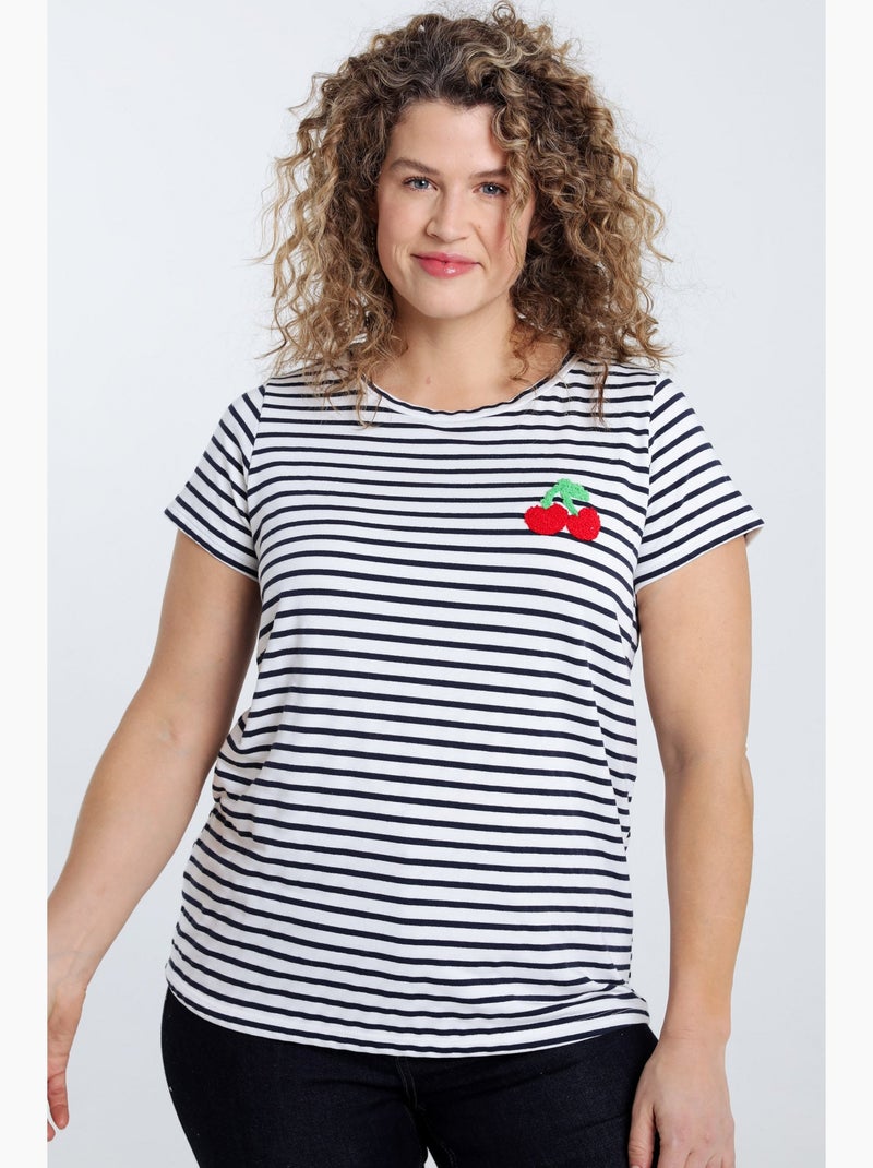 T-shirt marinière détail cerise - Blanc