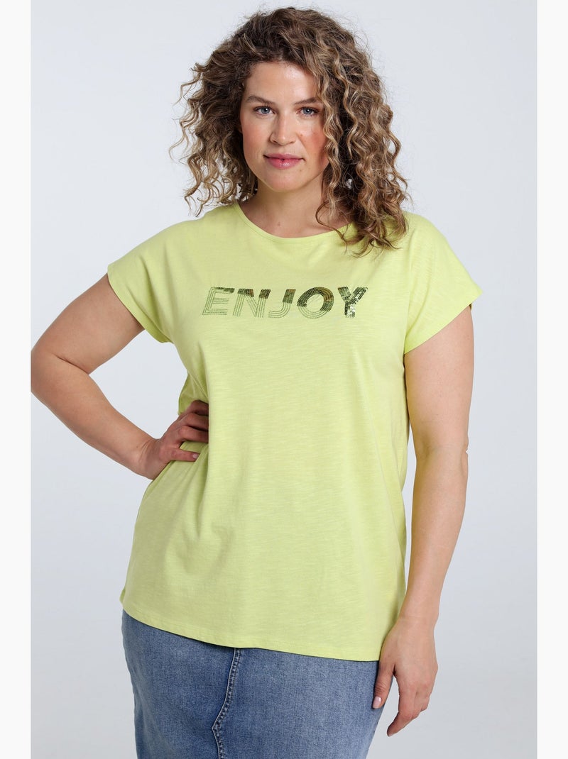 T-shirt uni avec broderie Enjoy et sequins - Jaune citron